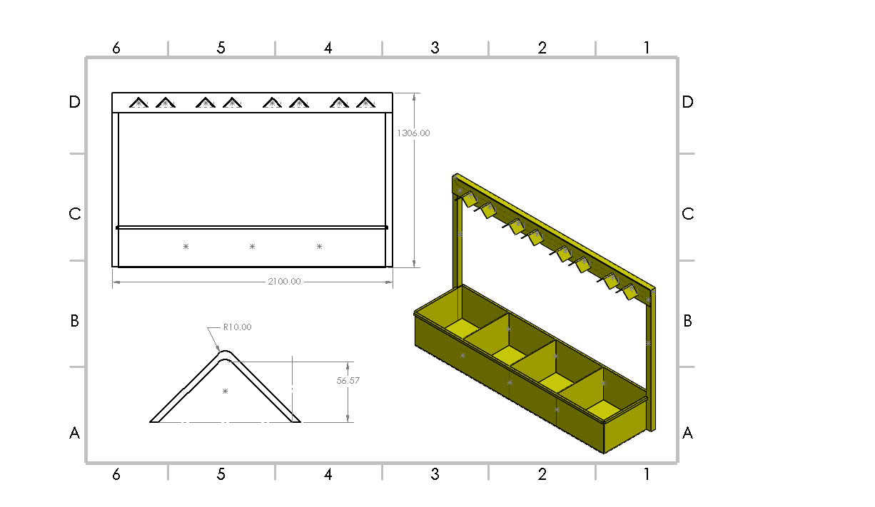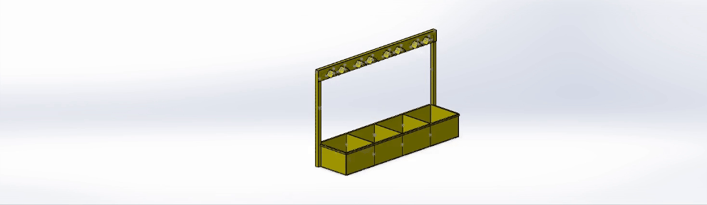 A digital rendering of a yellow-green tool organizer with four storage compartments at the bottom and six hooks or holders at the top for hanging tools.