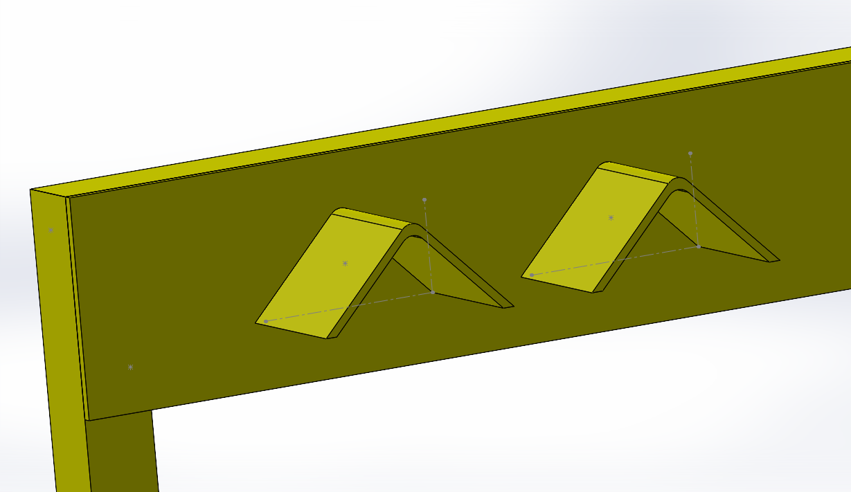 A digital 3D model of a yellow-green structure with two sloped supports attached to a large flat rectangular panel.