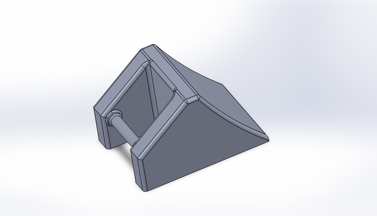 3D model of a small mechanical part with a sloped surface, two side supports, and a cylindrical pin connecting the supports.
