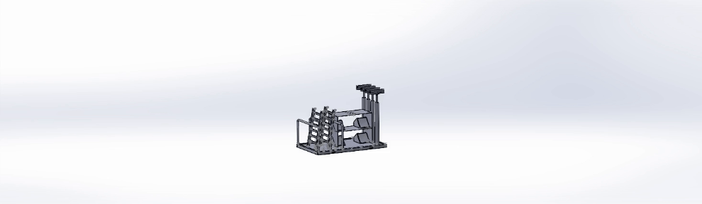 3D CAD model of industrial equipment with pipes, a box-like structure, and safety railings on a platform.