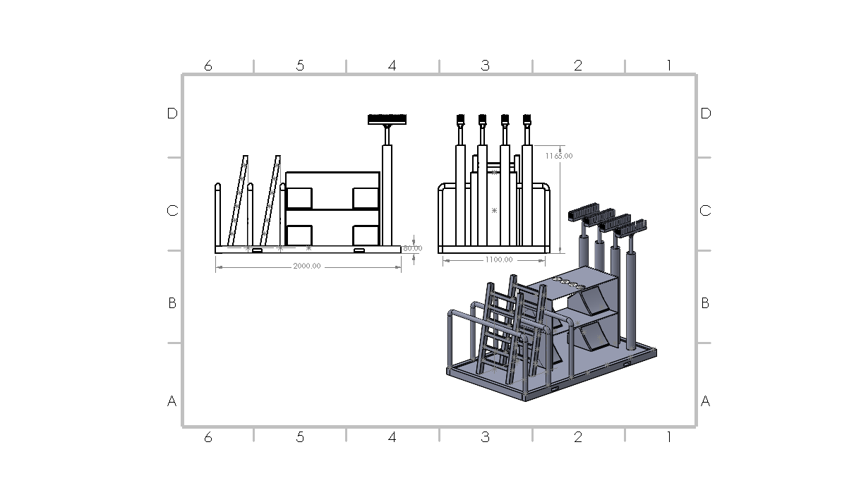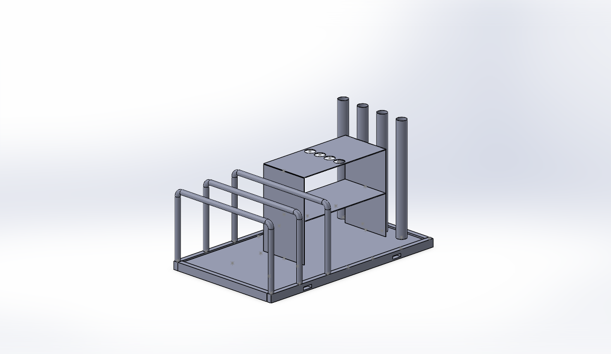 3D CAD model of industrial equipment with pipes, a box-like structure, and safety railings on a platform. View fullsize