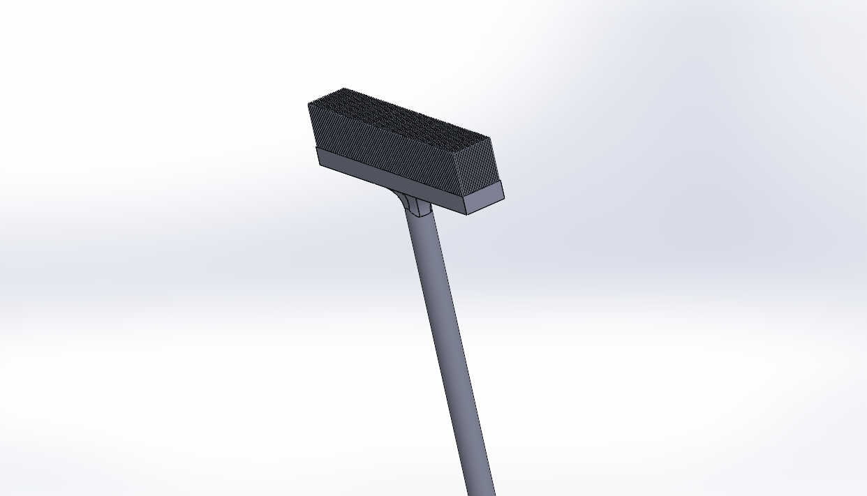 A 3D rendering of a street lamp with a rectangular black light fixture mounted on a tall, slightly curved pole against a light, cloudy background.